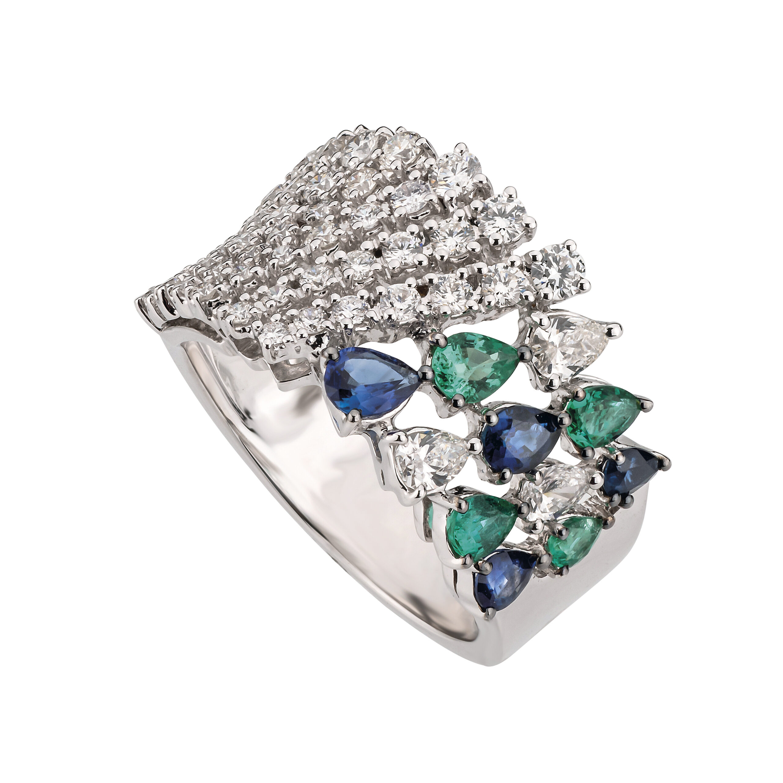 Anello realizzato in Italia da maestri orafi in oro bianco 18kt con diamanti taglio brillante e taglio goccia , smeraldi taglio goccia e zaffiri taglio goccia .