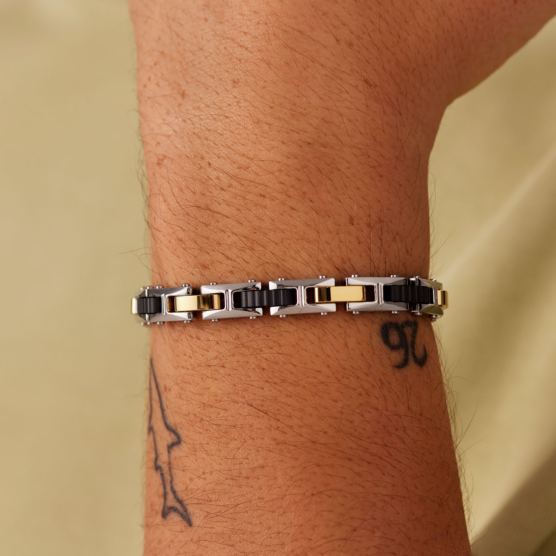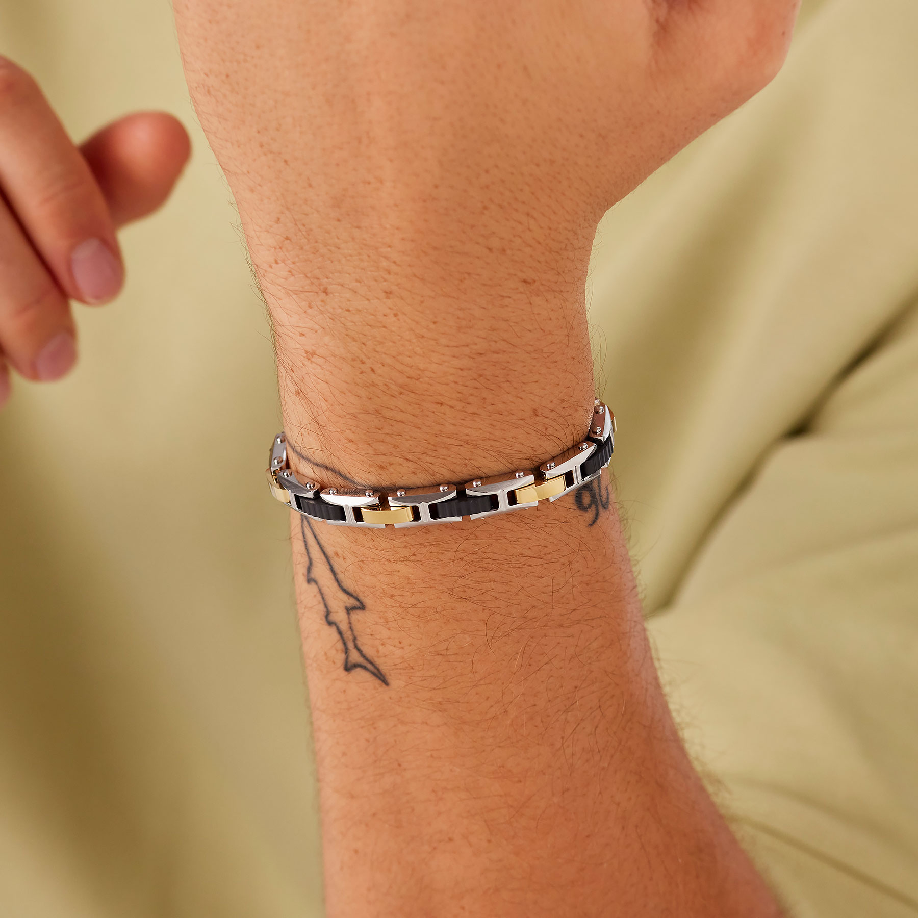 Bracciale in acciaio 316L e finitura pvd colore rutenio e finitura pvd oro 14K