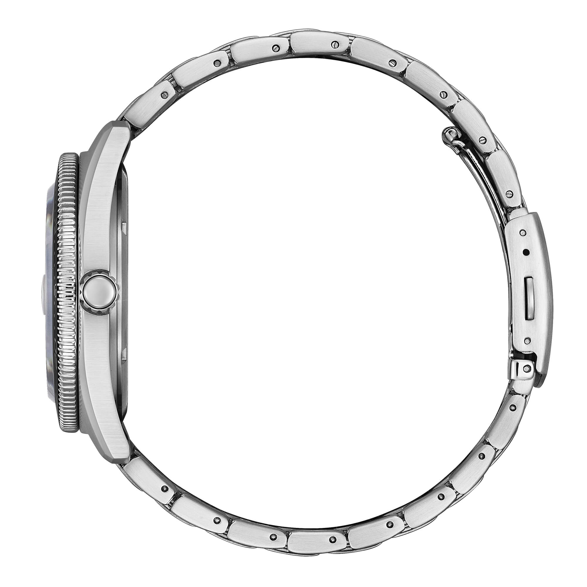 Cassa in acciaio. Fondo serrato a vite. Bracciale in acciaio con chiusura di sicurezza a pulsante. Ghiera in alluminio. WR 10 bar