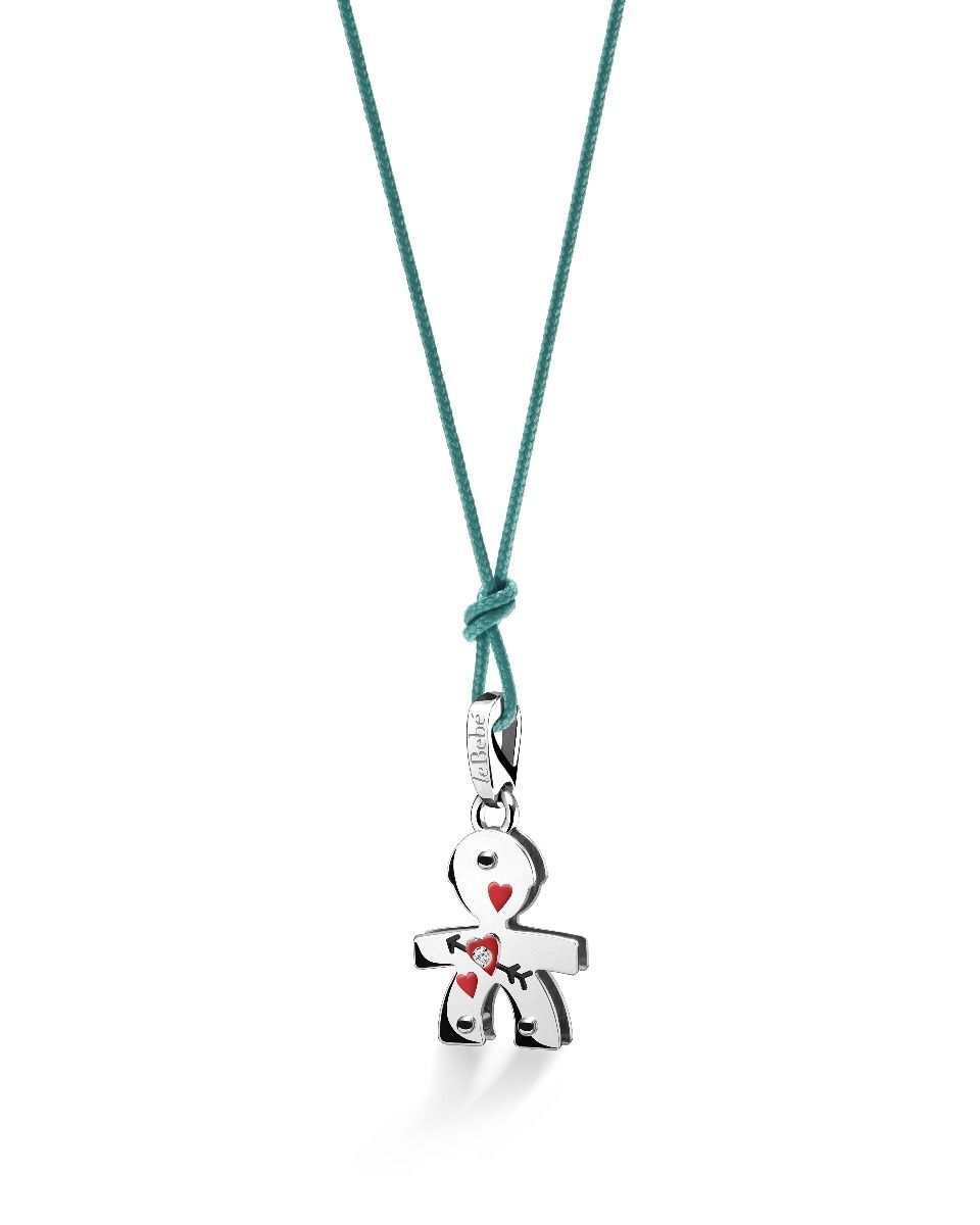 Sull’Oro Bianco 9 Kt lo smalto disegna un cuore con la freccia, simbolo dell’amore vero, resistente e puro, come il Diamante che illumina il ciondolo.
