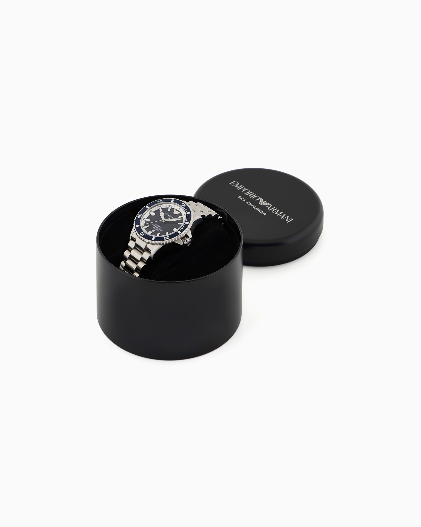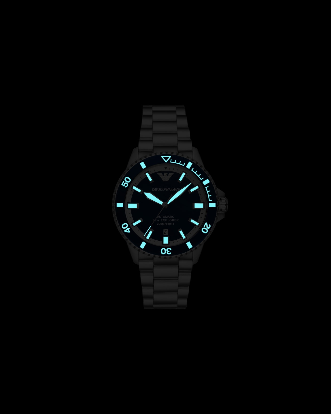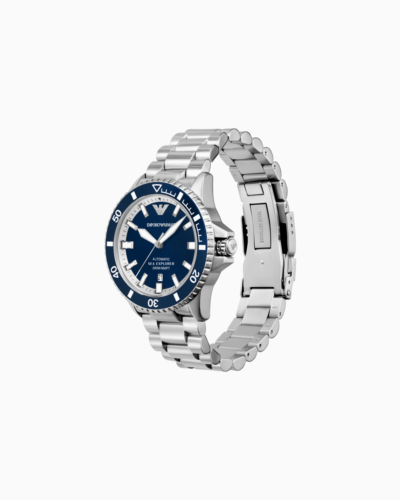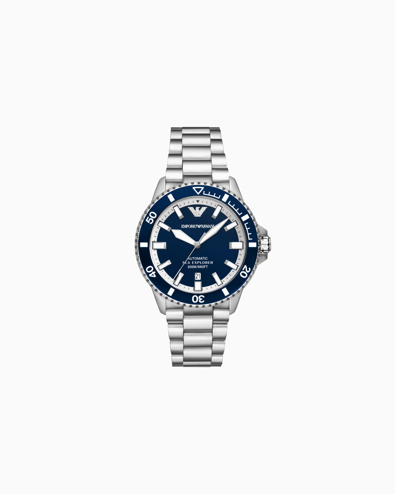 Orologio da 42,5 mm con quadrante lucido in smalto blu, inserto in alluminio blu sulla lunetta, Super-LumiNova® su lancette, indici e marcature, vetro zaffiro, movimento automatico, 20 ATM, corona a vite e bracciale in acciaio