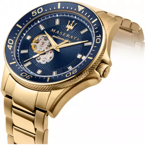 OROLOGIO MASERATI SFIDA – R8823140004 – Genere: Uomo, Materiale e finitura cassa: Acciaio, Pelle, Diamanti, Misura cassa: 44mm, Spessore cassa: 13,00, Finitura cassa: Satinato, Colore cassa: Gold, Vetro: Vetro zaffiro, Materiale cinturino: Pelle, Colore cinturino: Blu, Oro, Chiusura: Fibbia a farfalla, Movimento: Automatico, Water resistant: 10 atm, Garanzia: Ufficiale 2 anni Maserati, Confezione: Originale Maserati